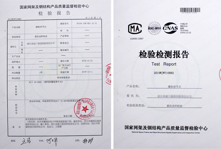 所用螺栓球節點均通過國家產品質量檢驗